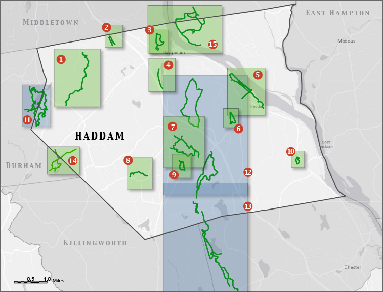 Eagle's Beak Trail Nedobity Preserve Trail Swan Hill Trail Higganum Reservoir Trail Haddam Meadows State Park Bamforth Wildlife Preserve Trail Rt. 81 Loop Ponsett Ridge Preserve Trail Washburn Preserve Trail Saraceno Preserve Trail Millers Pond State Park Cockaponset State Forest, Northern Section Cockaponset State Forest, Southern Section